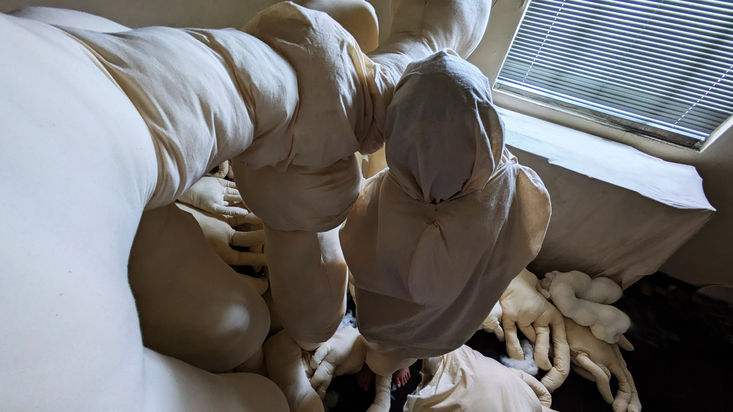 後悔から抜け出せず、生活が自分でできなくなり、それによって自分や周りの家族や友人も、どうすることもできない苦しみを味わいます。苦しんでいるのは、限界に達している体だけでなく、囚われた感情であり、外の世界ときちんと交流できなくなってしまいます。憎しみや罵りが、唯一の現実であるかのように感じます。しかし、表面上の負面感情は、実はお互いの心の奥深くにある、言えなかった言葉や感情を隠しているのです。それは、過去への後悔、今の現状への不満、または謝罪や愛情かもしれません。たとえ、お互いの感情が未だ不明で、確認できないとしても、私たちはまだ愛を持っていると信じるしかありません。この作品を通して、観客に触ることで、「愛している」という残った息吹を感じてもらいたいです。